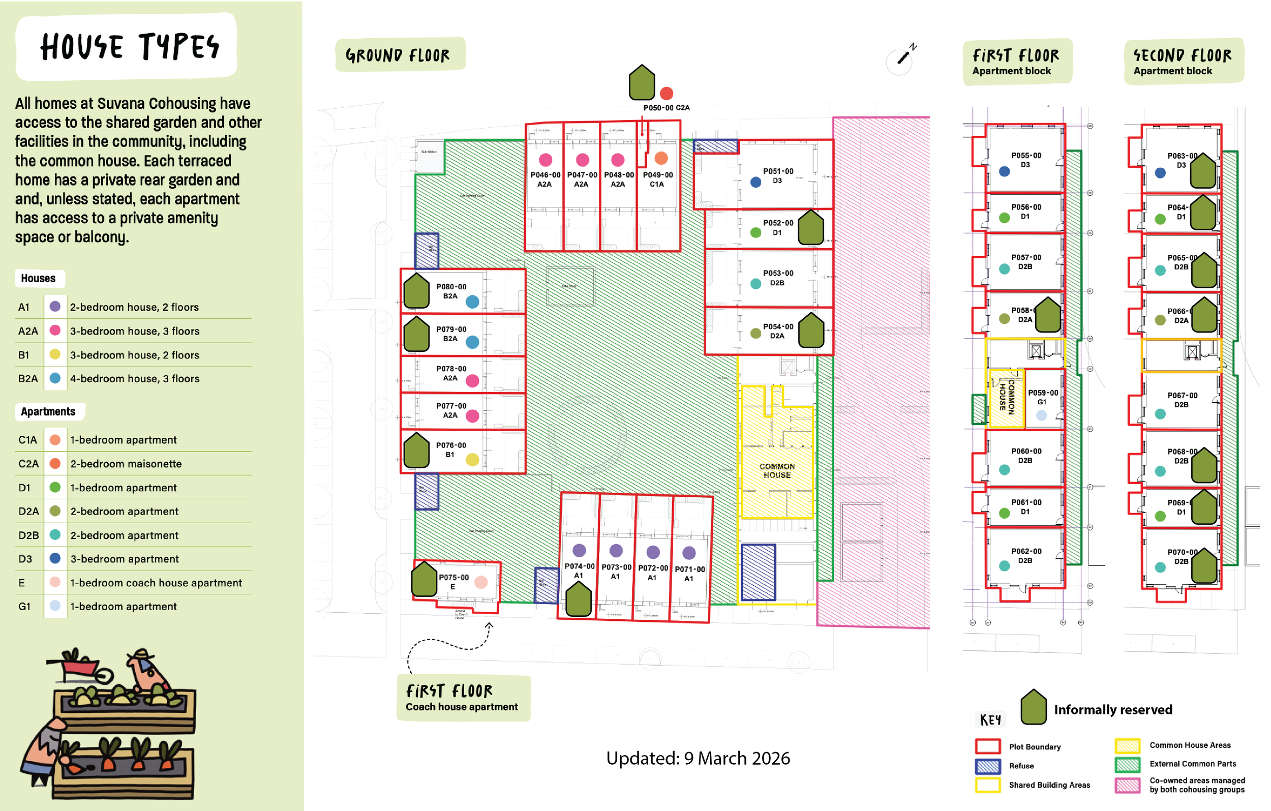 The plans, which have been co-designed with Suvana cocreators, comprise 35 properties: a mix of 2, 3 and 4 bed houses, and 1, 2 and 3 bed apartments. In addition to the individual properties, there are a range of communal spaces and facilities, the cost of which is already included the in price of the individual properties.